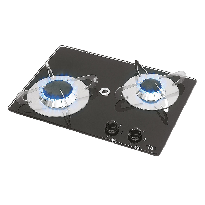 Встраиваемая 2-х конфорочная газовая плита Can PV 1351 из закалённого жаропрочного и устойчивого к царапинам чёрного стекла станет украшением кухни жилого прицепа, фургона, автодома, кемпера или камбуза катера, яхты.