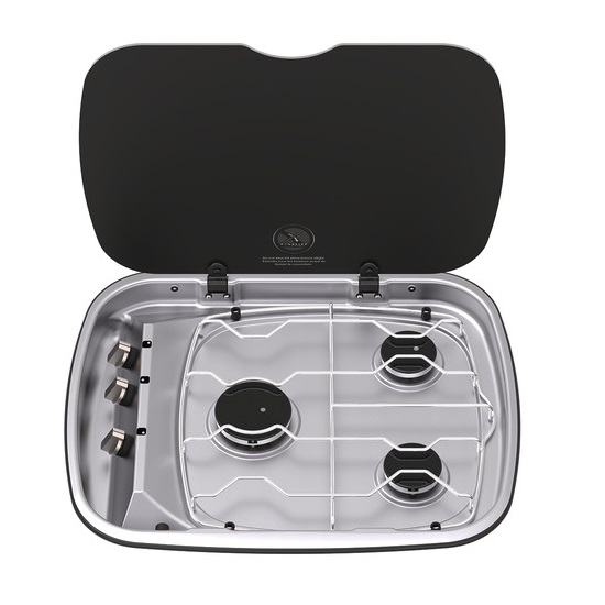 Варочная панель Argent прямоугольной формы из нержавеющей стали от компании Thetford имеет три газовые конфорки и крышку из термостойкого чёрного стекла. Рукоятки управления конфорками располагаются слева от них. Плиту можно комбинировать с раковинами Thetford аналогичной серии.