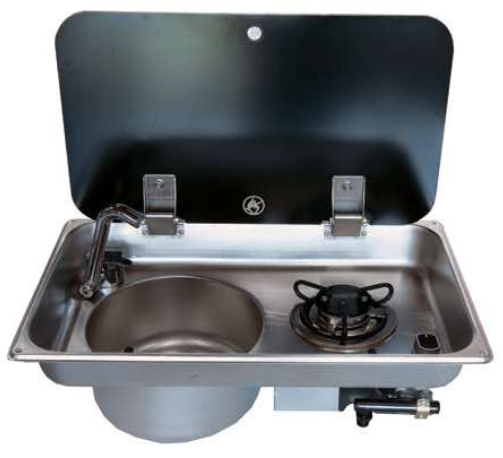 Camper-Marine GR-902S Варочная поверхность газовая одноконфорочная с круглой раковиной, нержавеющая сталь со стеклянной крышкой и пьезоподжигом, левая.