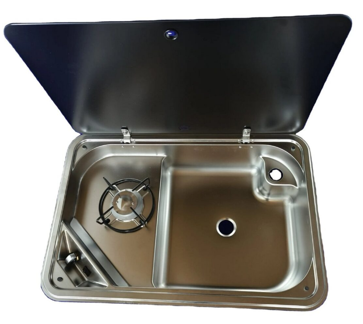 Camper-Marine GR-933 Варочная поверхность газовая встраиваемая одноконфорочная из нержавеющей стали с раковиной со стеклянной крышкой и пьезоподжигом, правая.