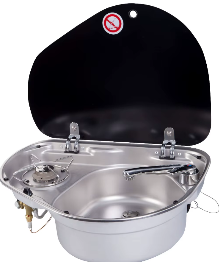 Camper-Marine GR-600R Варочная поверхность газовая встраиваемая одноконфорочная из нержавеющей стали с круглой раковиной со стеклянной крышкой и пьезоподжигом, правая.